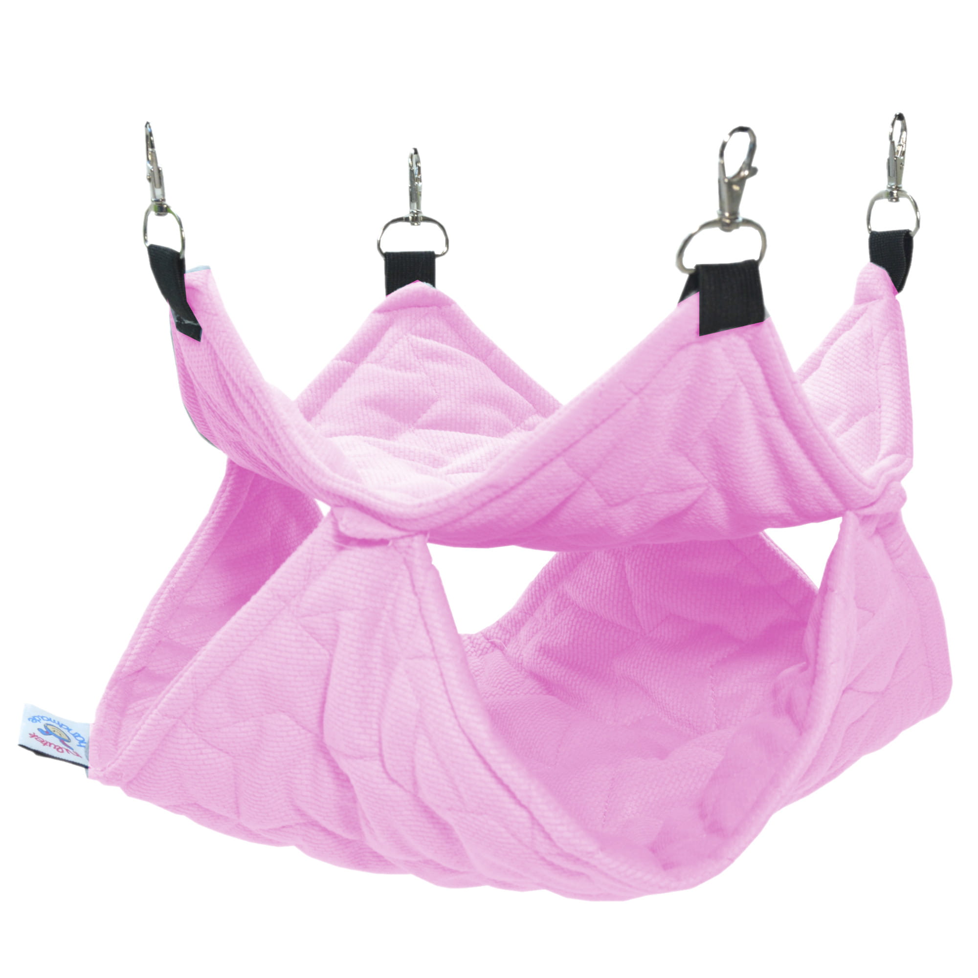 Hamak podwójny dla gryzonia, to przede wszystkim znakomity sposób na powiększenie przestrzeni w klatce. Dzięki specjalnym karabińczykom, mocujemy go na dowolnej wysokości, przez co zyskujemy dodatkową powierzchnię pod spodem. Na hamaku nasza świnka morska, szczur czy szynszyla odpoczywają, a pod spodem mogą swobodnie biegać, dzięki czemu nie brakuje im przestrzeni do zabawy.
