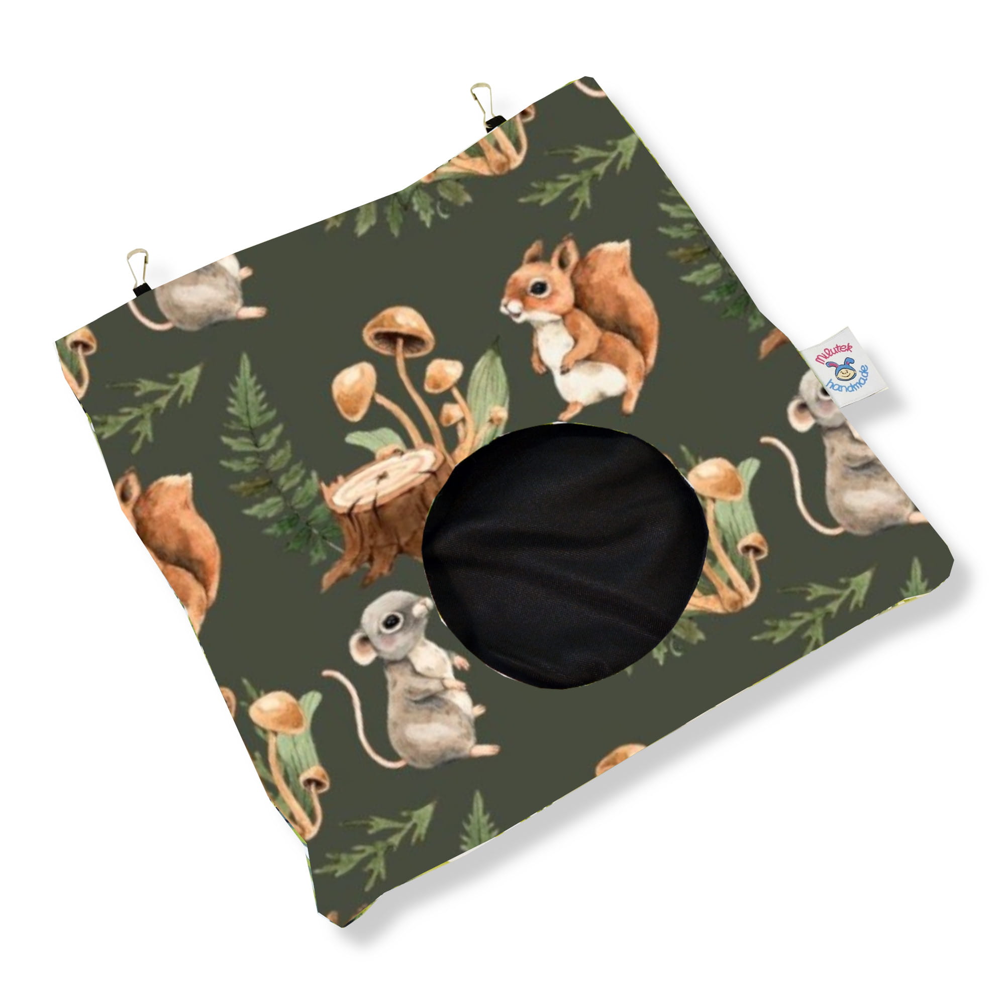 u góry znajdują się gumki z karabińczykami do mocowania do klatki.