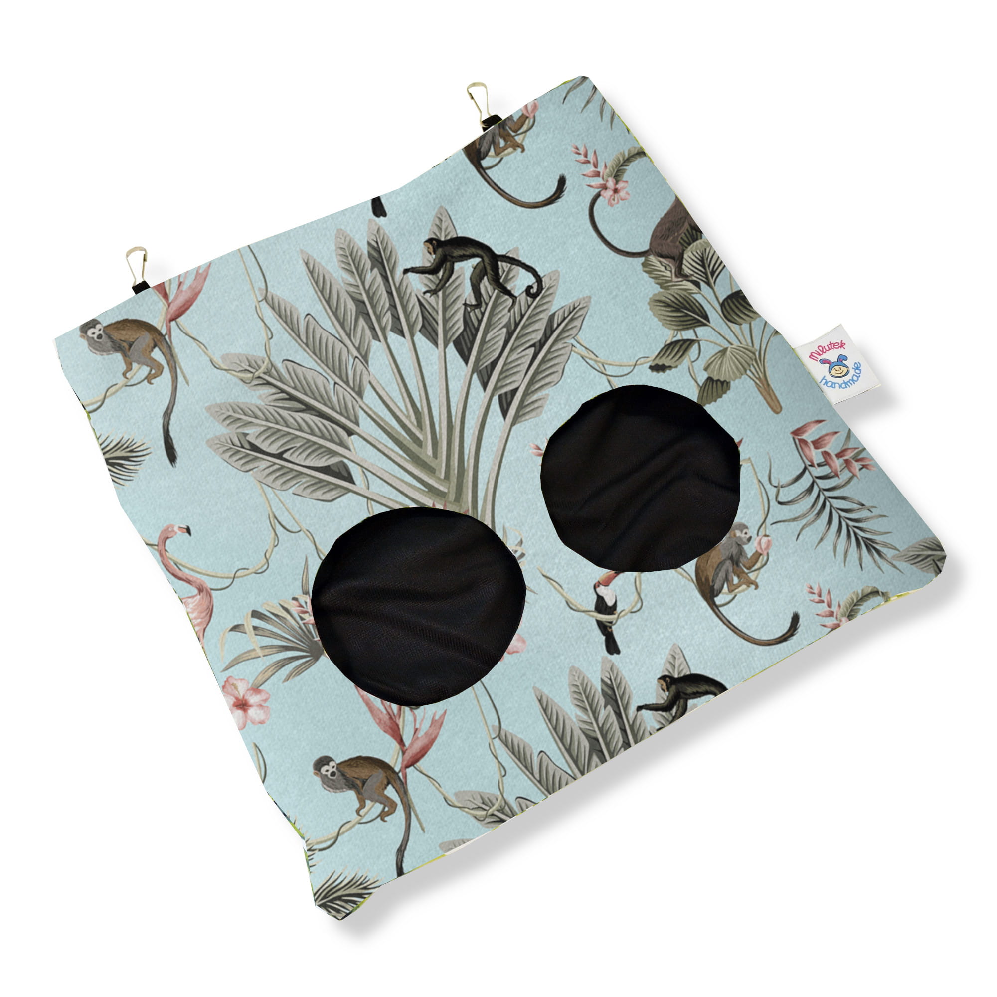 u góry znajdują się gumki z karabińczykami do mocowania do klatki.