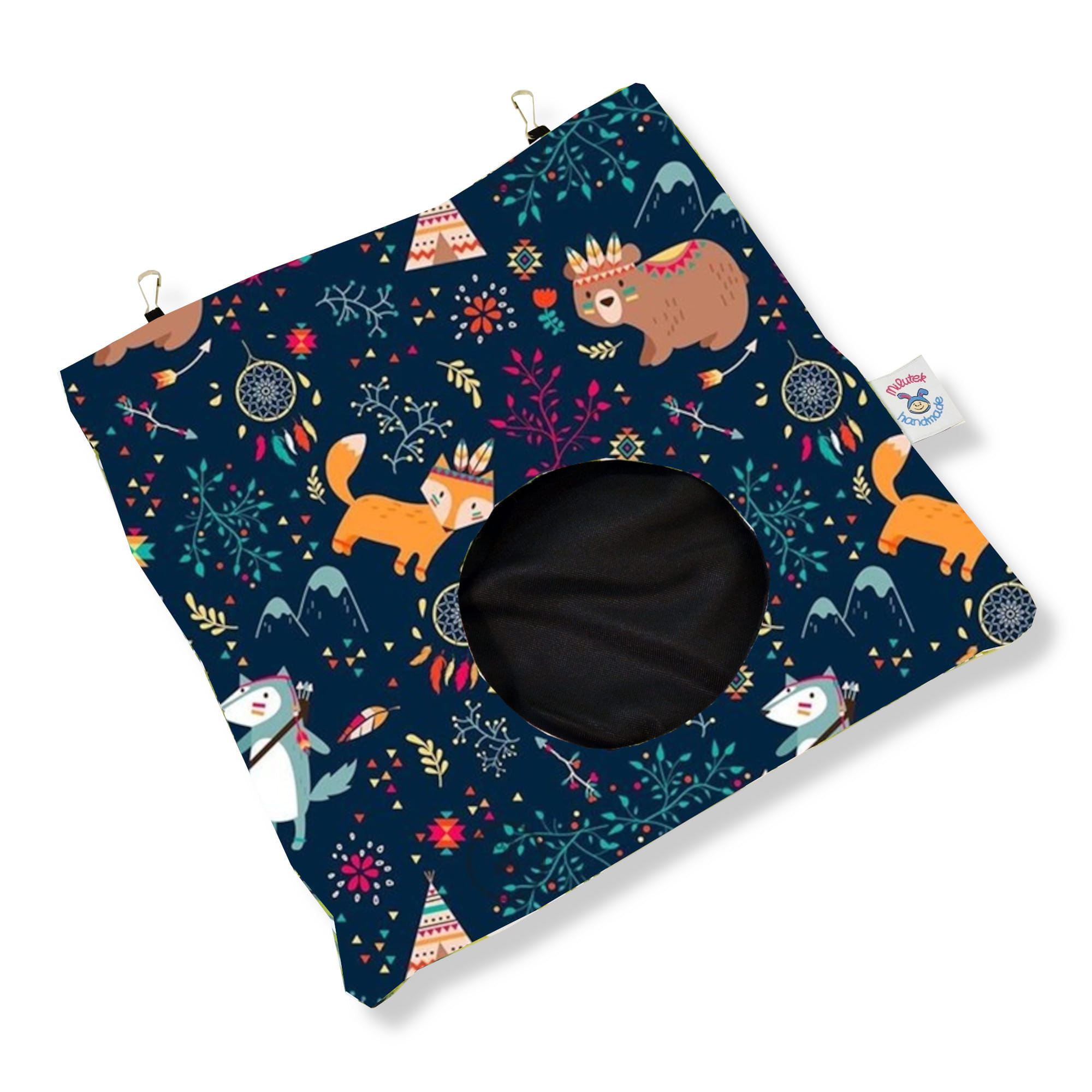u góry znajdują się gumki z karabińczykami do mocowania do klatki.